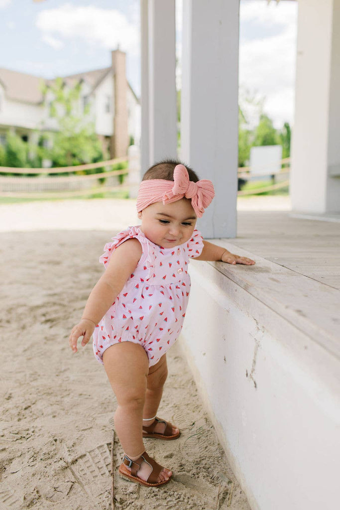 A fun and easy baby romper in our signature extra soft and stretchy fabric with ruffled sleeves, three button detail in front and three snap closure for easy changes!