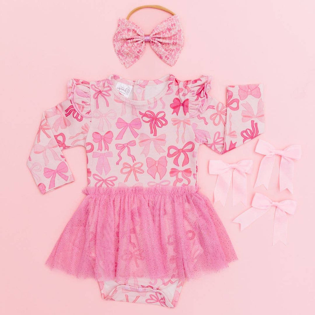 * Coquette printed tulle bow with pink glitter pin dot accents