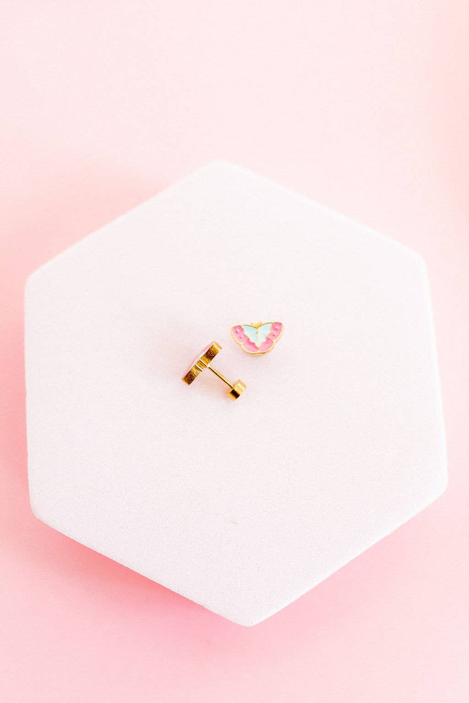 Bring a burst of color to any outfit with the Glossy Pink and Blue Butterfly Screwback Stud Earrings. These fun and playful studs are perfect for sensitive ears, with a secure screwback design that ensures a snug fit throughout the day. The 8mm size makes them ideal for both kids and adults, offering comfort and durability in one stylish package.