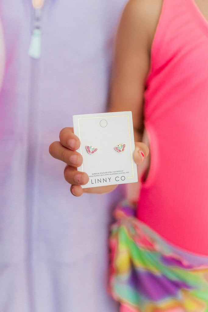 The glossy pink and blue enamel design features a beautiful butterfly shape, making these earrings a standout piece for any occasion. Whether you're dressing up for a special event, adding some flair to a casual outfit, or attending a family celebration, these studs are sure to shine.