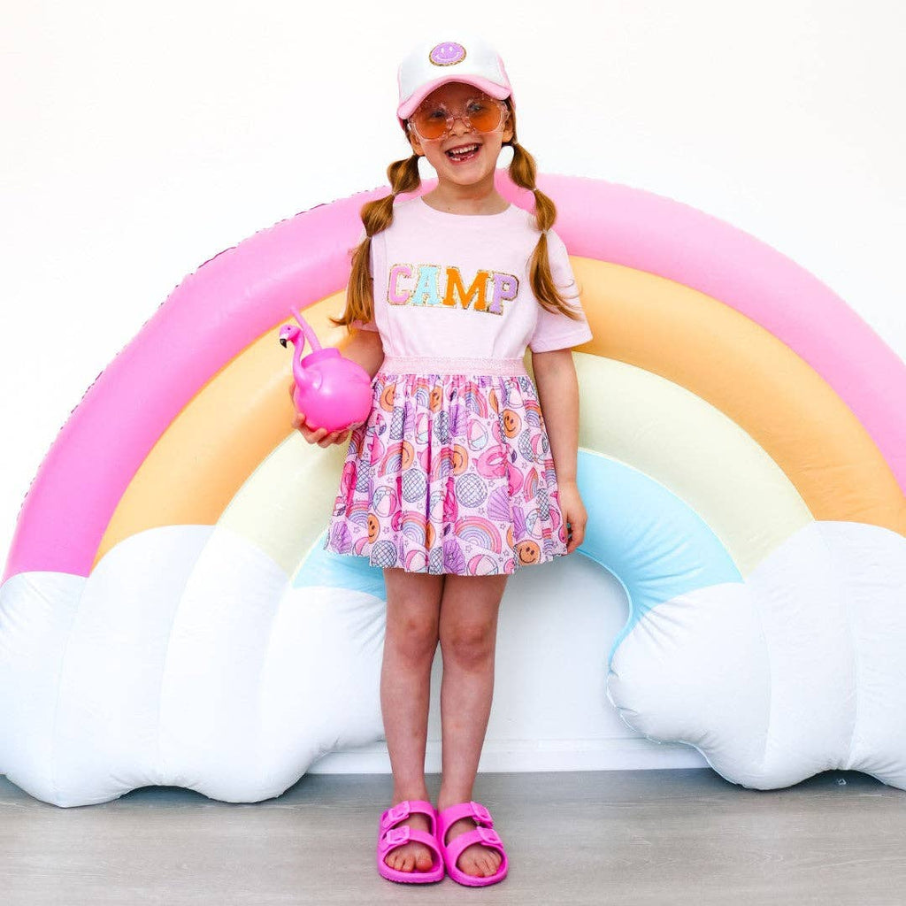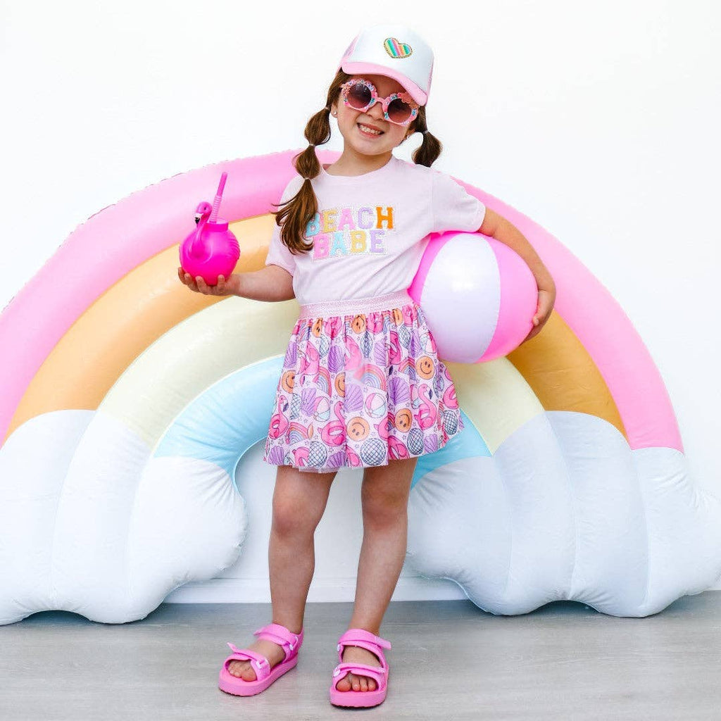 The Summer Fun Tutu is a fun skirt and dress up tutu to have fun in the sun! Features: * Light pink tulle printed with a summer fun pattern accented with pink glitter pin dots * Light pink cotton lining * Pink glitter waistband * Care: Hand wash and line dry The Sweet Wink difference: * Super soft tulle that doesn’t scratch or itch * Cotton lining provides extra coverage and comfort * “Shed-free” embellishments ensure glitter does not sprinkle around the house