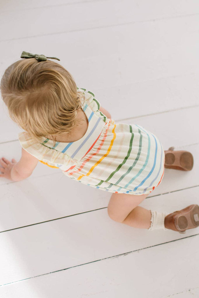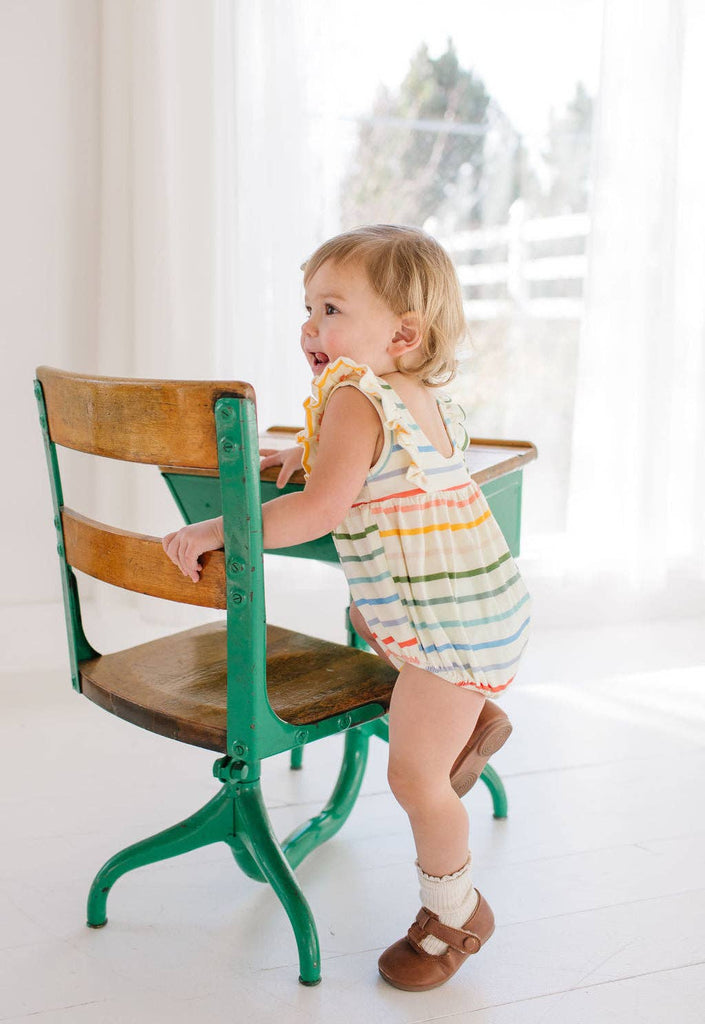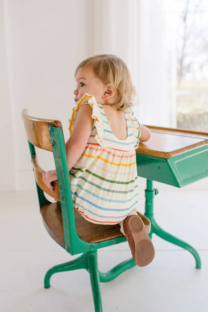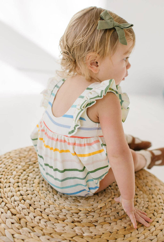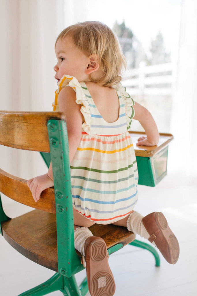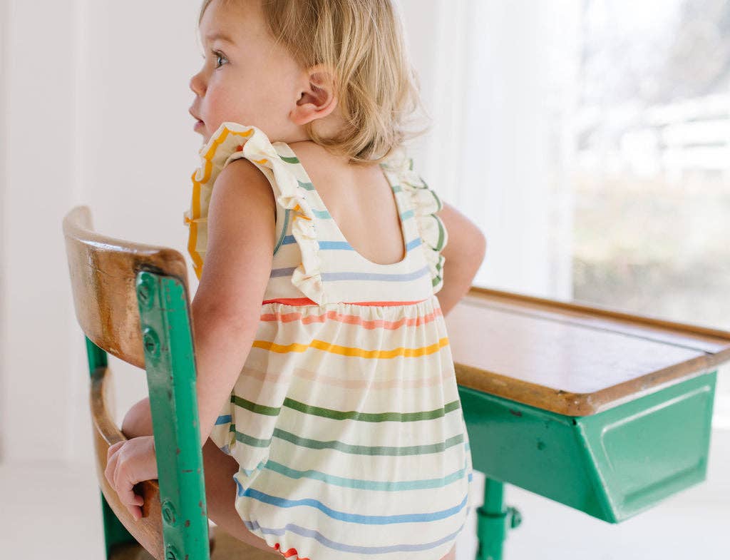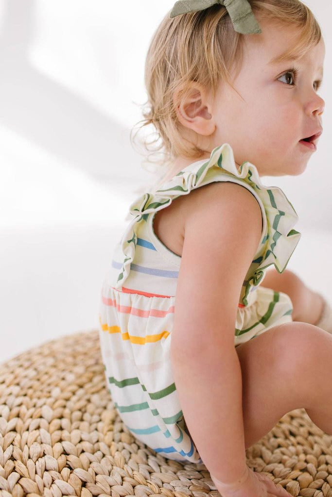 A fun and easy baby romper in our signature extra soft and stretchy fabric with a ruffled bottom, adjustable shoulder straps and three snap closure for easy changes!