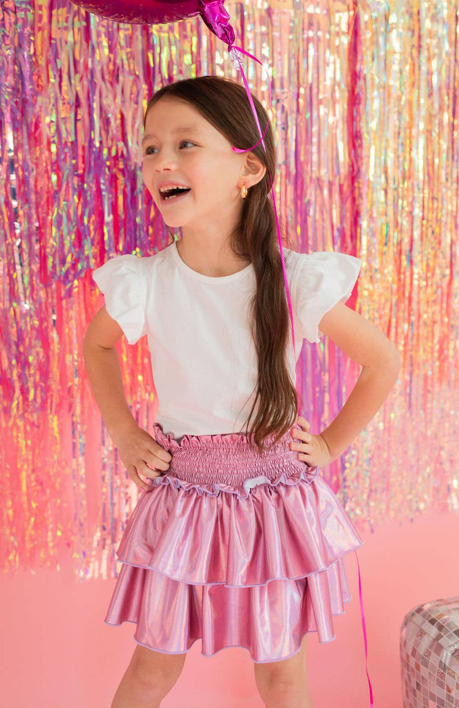 Our fun lamé skirt features a polyester short, ruffled shiny skirt and a comfortable elastic waistband. Pairs perfectly with our flutter tee in white or green!