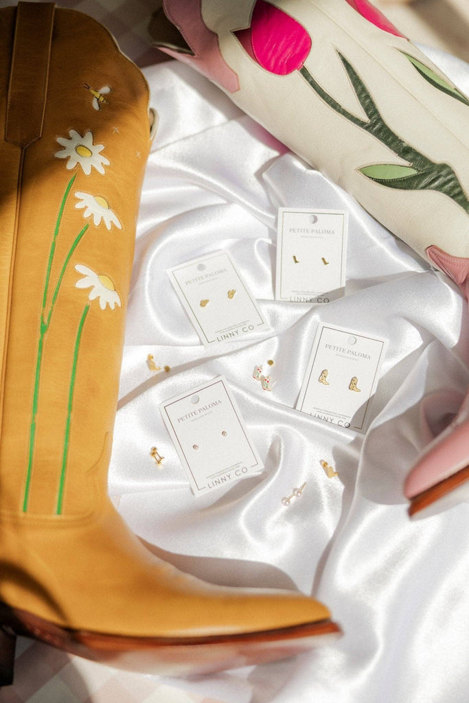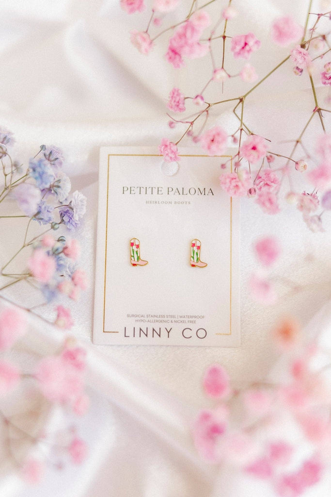 The Screwback Stud Earrings - Tulip Cowgirl Boot are inspired by Petite Paloma's best-selling Sadie Boot. These 10mm earrings feature a boot design with a delicate tulip detail, offering a charming and playful western look. The screw back earrings ensure a secure and comfortable fit, making them perfect for all-day wear. hypoallergenic and lightweight, these earrings are ideal for both teens and adults.