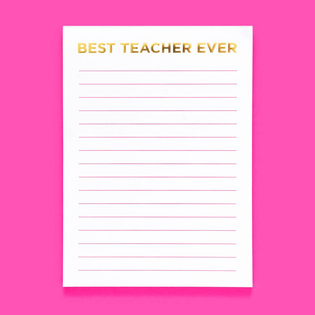 This 5x7 notepad is the perfect gift to show teachers some love for the holidays, back to school, or just because they're an awesome teacher! Complete with metallic gold foil and a magnet on the back. Details *Size: 5x7 inches *50 lined sheets *Shiny gold foil on each sheet *Magnet on back *Shrink-wrap packaging *Imported Our list pads make unique gifts for teacher gifts, back to school shopping, Halloween, Sunday School teacher gifts, stocking stuffers, holiday gift bundles, gift sets, Valentine's Day gifts, Easter baskets, Mother's Day gifts, and graduation gifts! MINIMUM QUANTITY: 4 SKU: NP-03