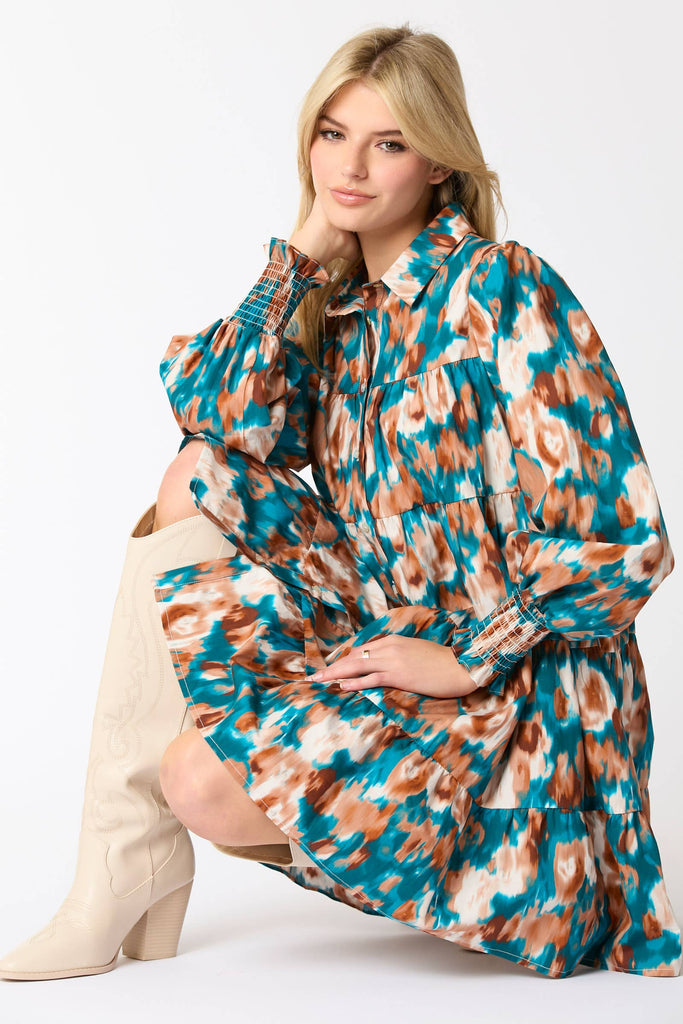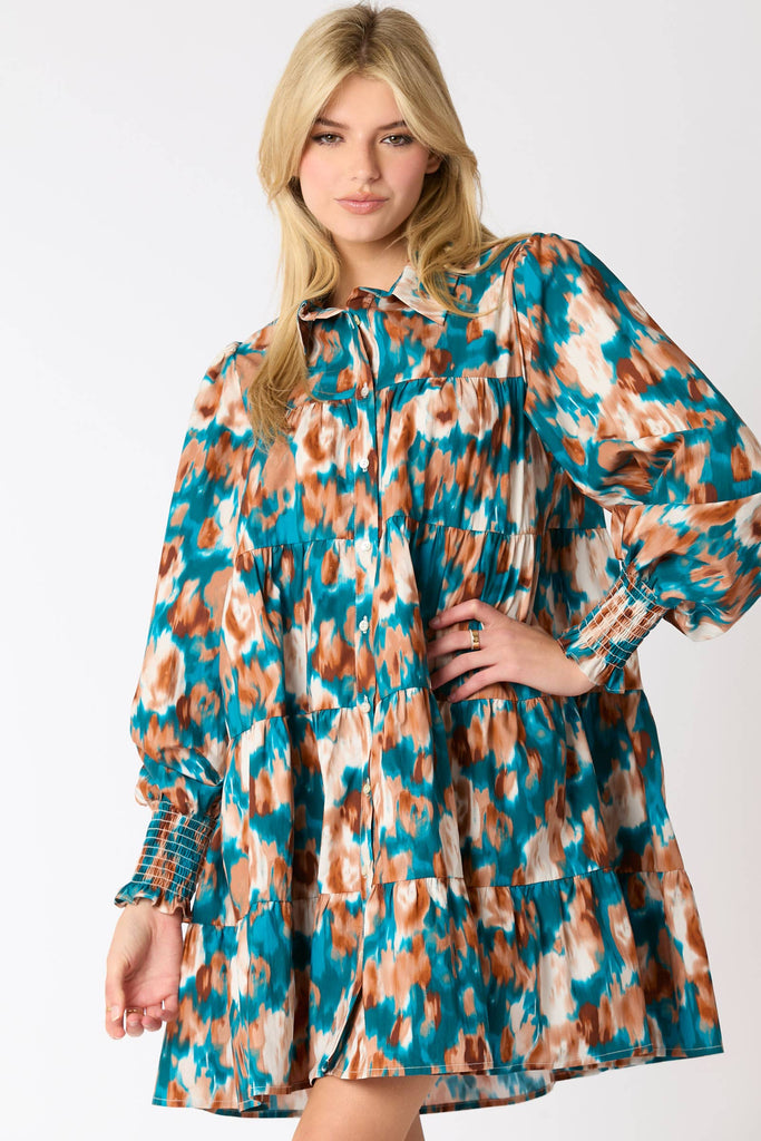 Button down Shirt Mini Dress -Collared -Long balloons sleeves -Smocked cuffs -Button-down closure -Tiered 100% Cotton Made in China