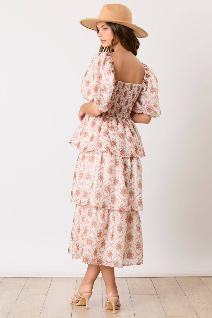 Bow & Rose Printed Puff Sleeve Tiered Midi Dress