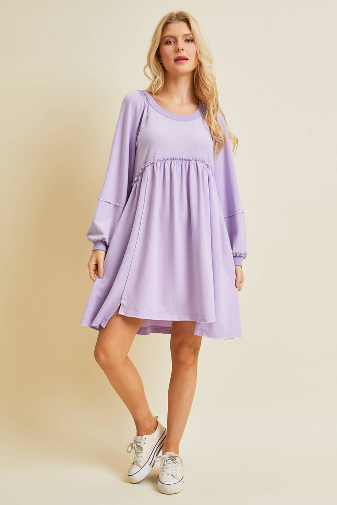 FLOWY FLARE BABYDOLL DRESS FEATURED IN A MINI LENGTH AND SOFT BABY FRENCH TERRY FABRICATION WITH POCKETS