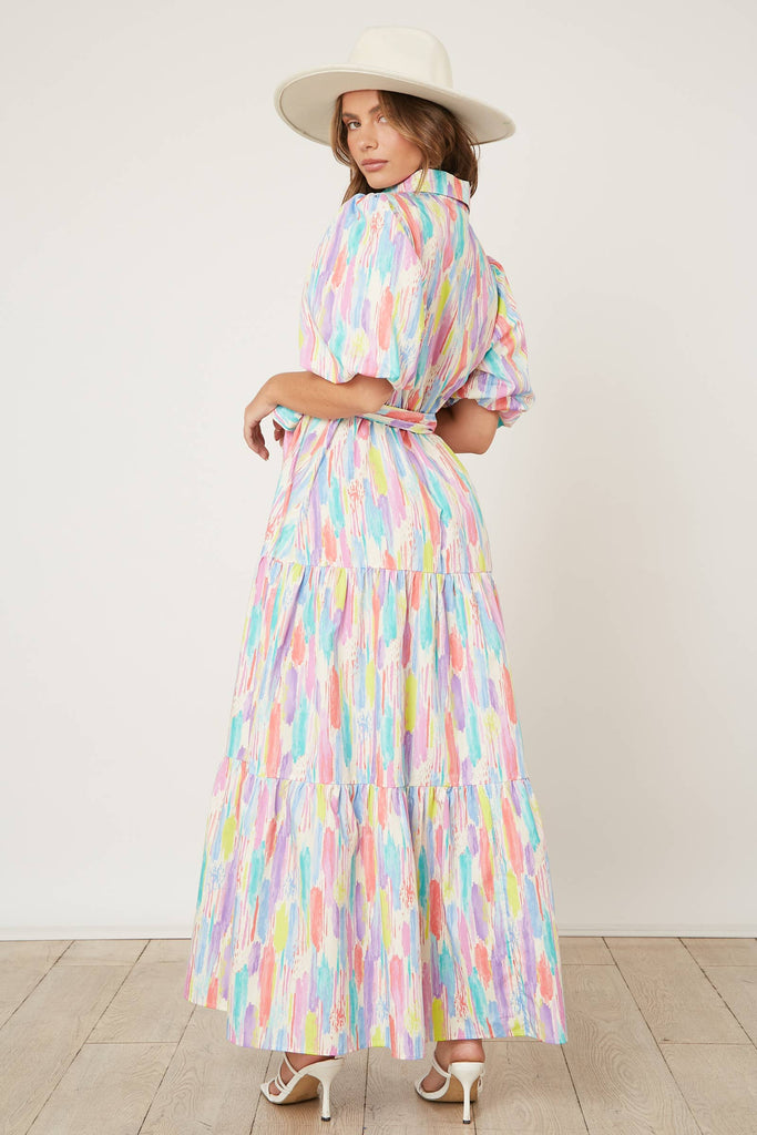 Poplin Puff Sleeve Maxi Shirt Dress - Short puff sleeves - Tiered - Front button down closure - Waist tie - Multicolor fiber print pattern