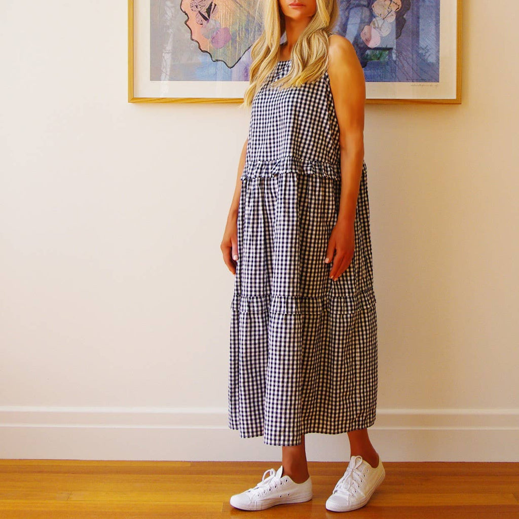 Super Cute Rosie sleeveless cotton gingham dress. Available in 2 sizes and 3 colours. Yes, she has pockets. S/M: 8 -10 M/L: 12 - 14 Relaxed fit