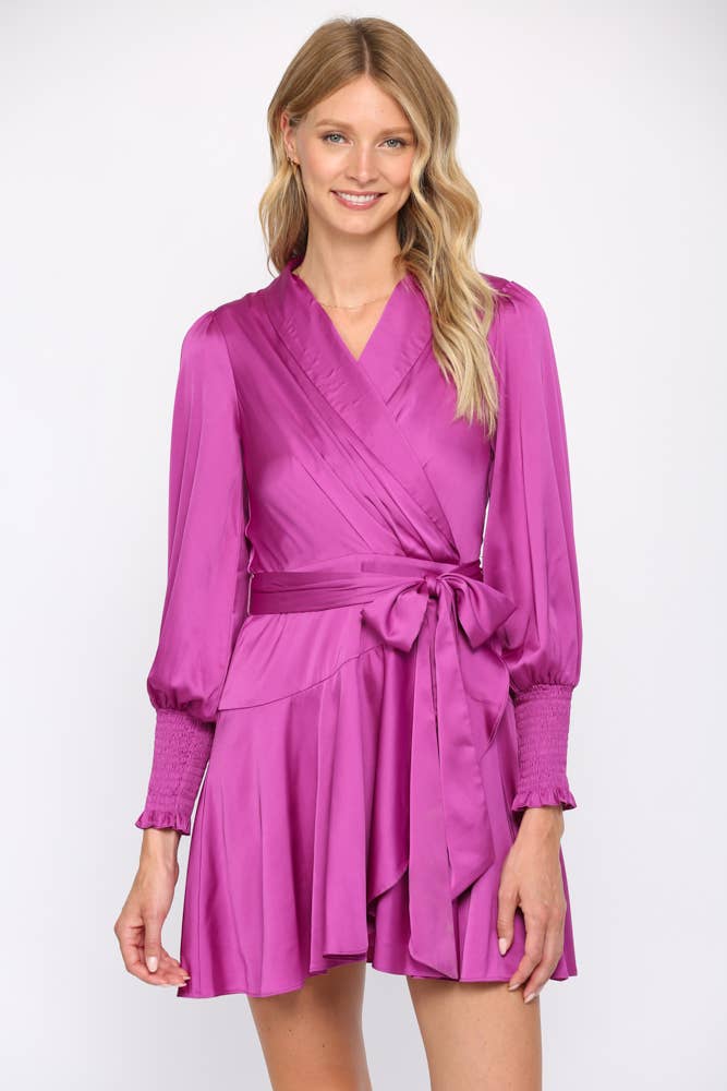 SATIN TIE WAIST WRAP DRESS SELF: 95% POLYESTER, 5% SPANDEX LINING: 100% POLYESTER