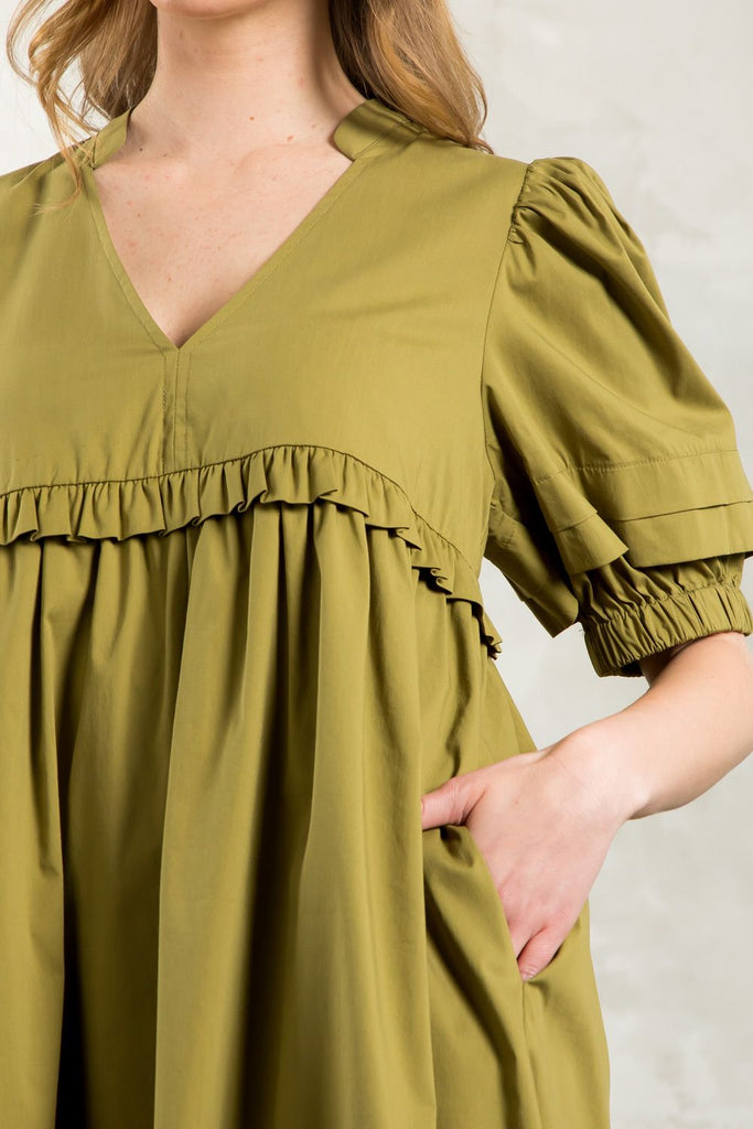 Flower Trim Detail Half Zip Puff Sleeve Dress