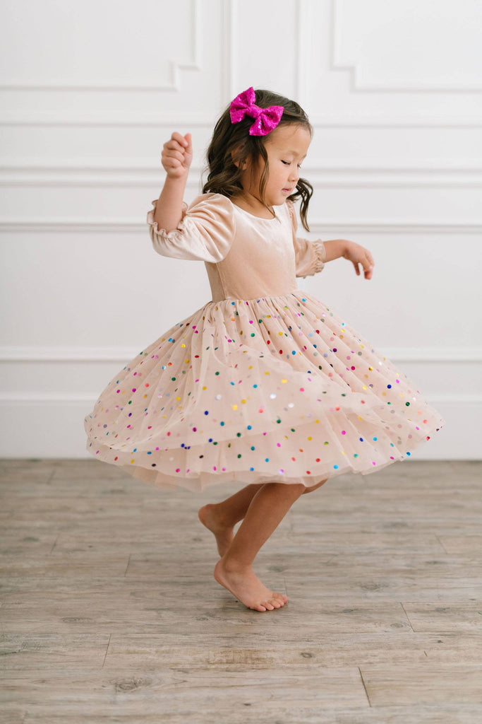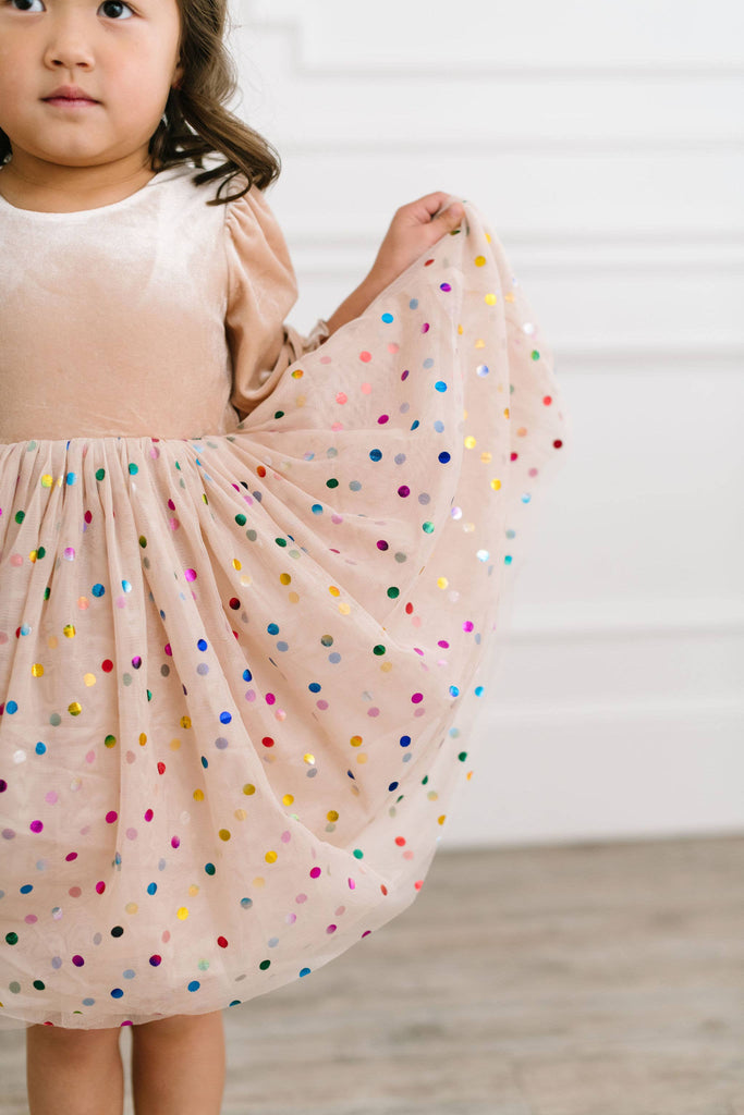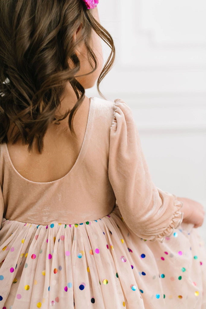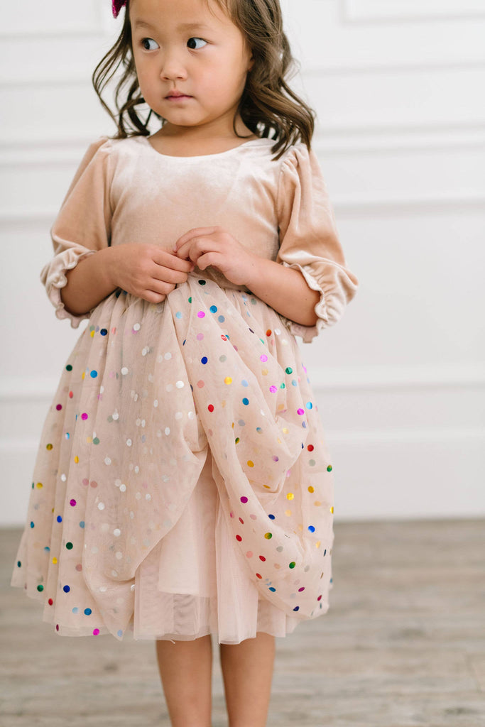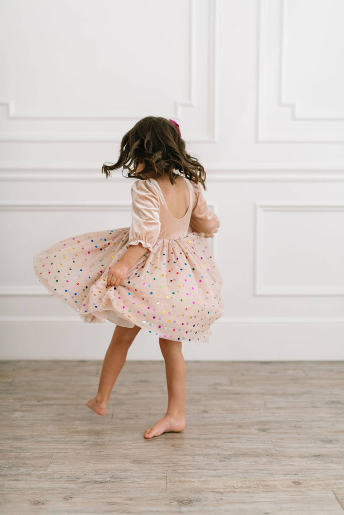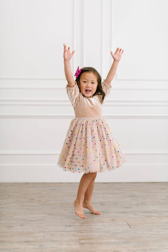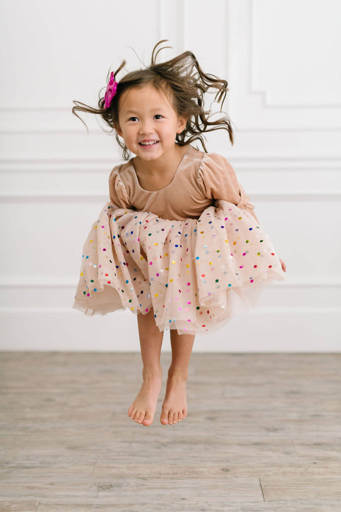 A new spin on the best selling confetti style, with an upgraded sleeve style, longer tulle and the same fun yet sweet look we all love! Featuring a 4 layer tulle skirt with confetti style embellishments and a soft, solid polyester layer under the skirt, attached to our velvet bodice with scoop back and elastic cuffs on the 3/4 length sleeve Our confetti tulle skirt is so fun and colorful - great for birthdays, dressup and holidays, or just being fancy around the house!