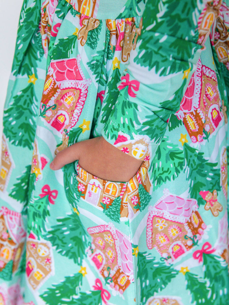 A frosty and festive forest is home to a winter wonderland full of gingerbread friends! Pairs well with Emerald Green, Pink, Hot Pink.