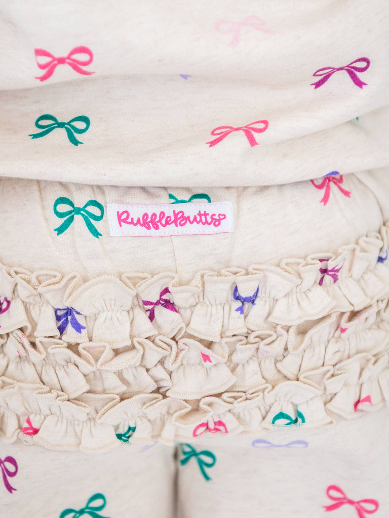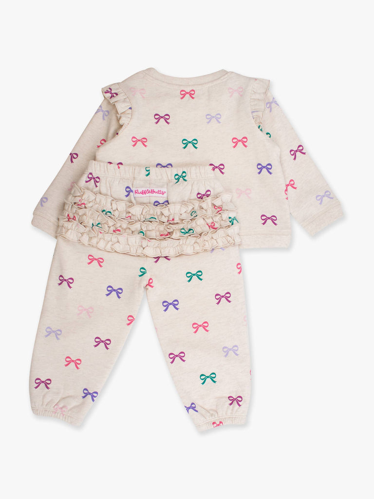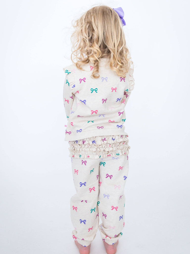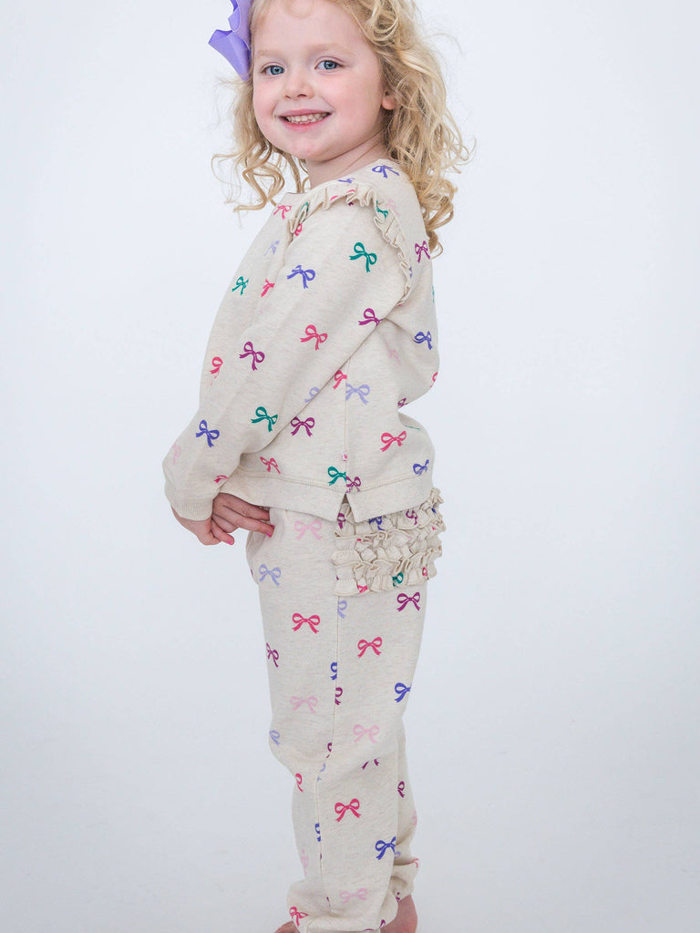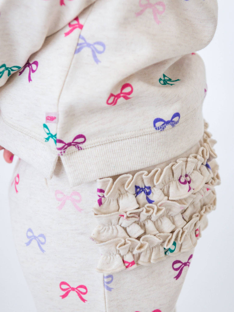 Toddler Girls Heather Oatmeal Ribbons Flutter Sweatshirt Jogger Set with Signature Rear Ruffles
