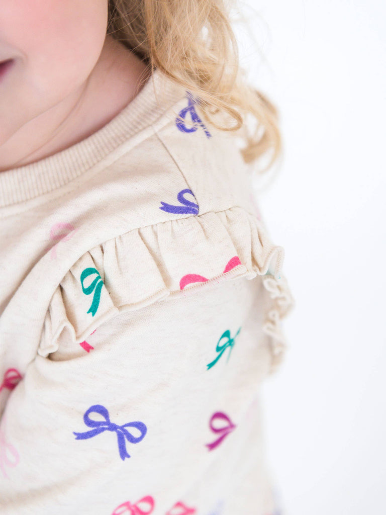 Sweet multi-colored bows are scattered against a soft, heathered oatmeal knit background. Pairs well with Emerald Green, Plum Tart, Hot Pink, Lavender.