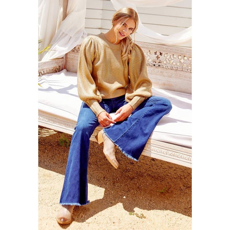 - Metallic knit pullover with a U-neck, long lantern sleeves, and ribbed hems.