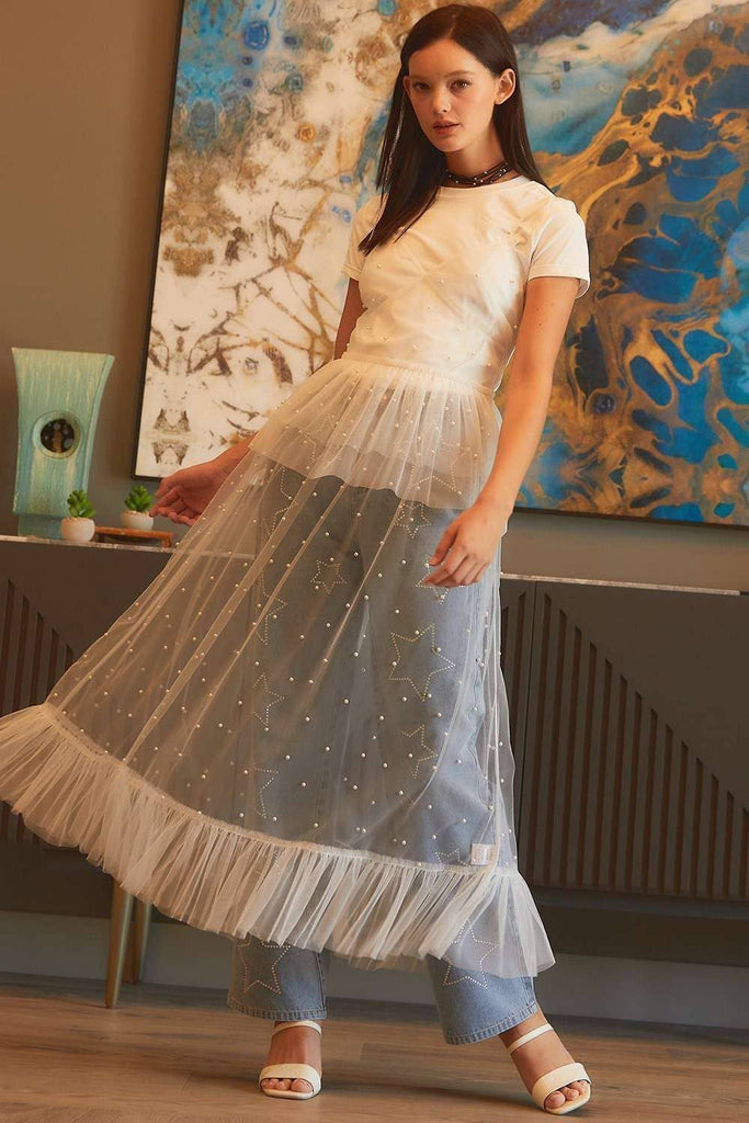 V-Neck Adjustable Shoulder Strap Pearl Ruffle See through Mesh Dress
