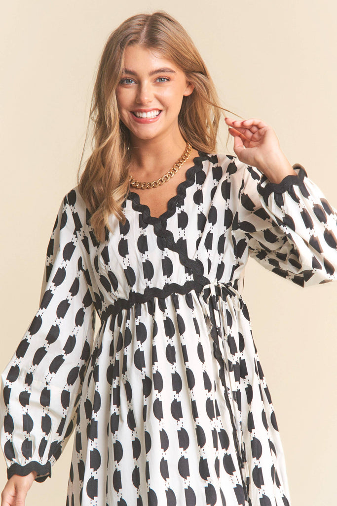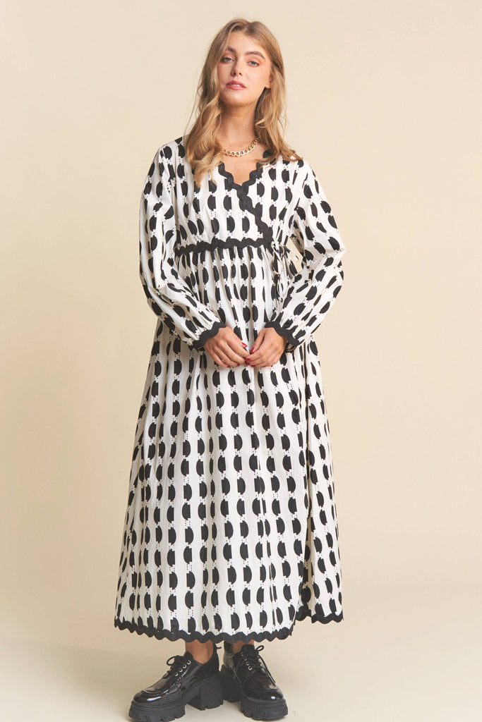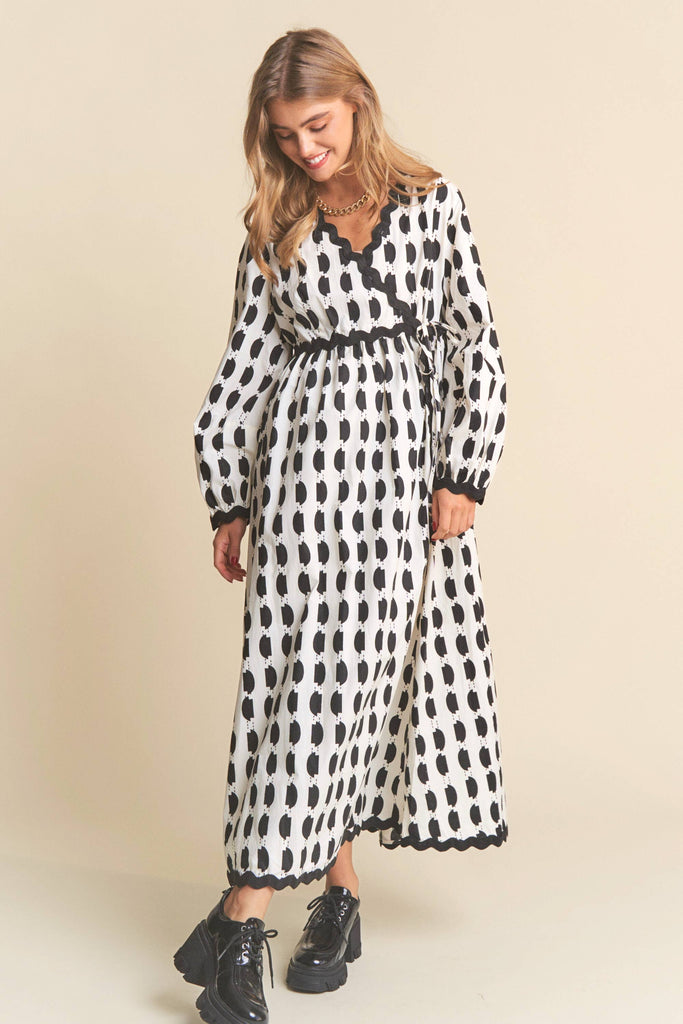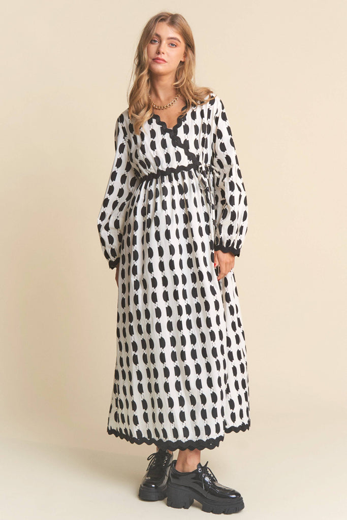 Women's maxi dress. Designed with a black and white spots pattern and a wavy trim detail. Wrap design.