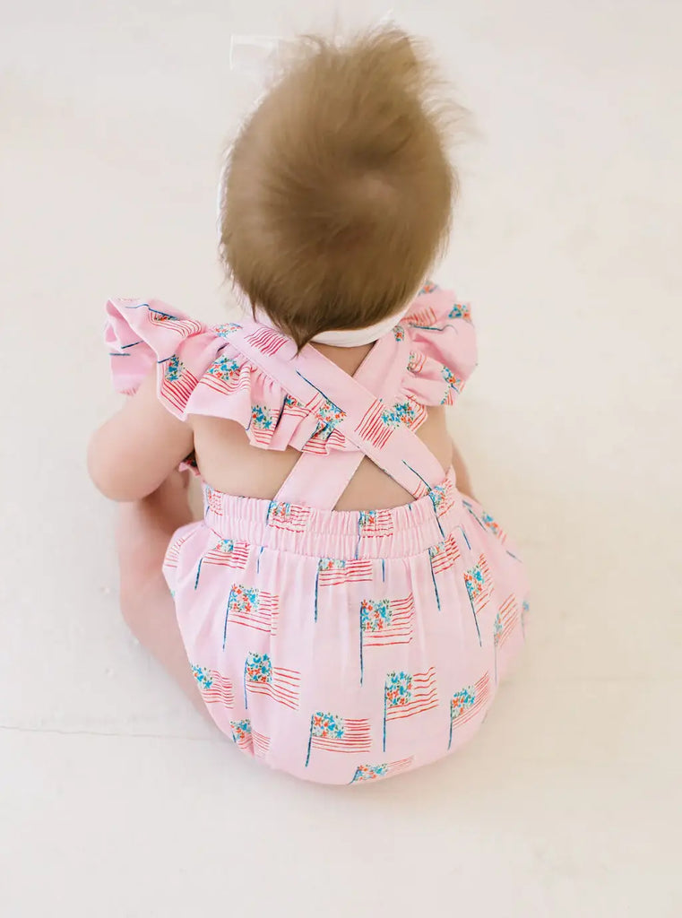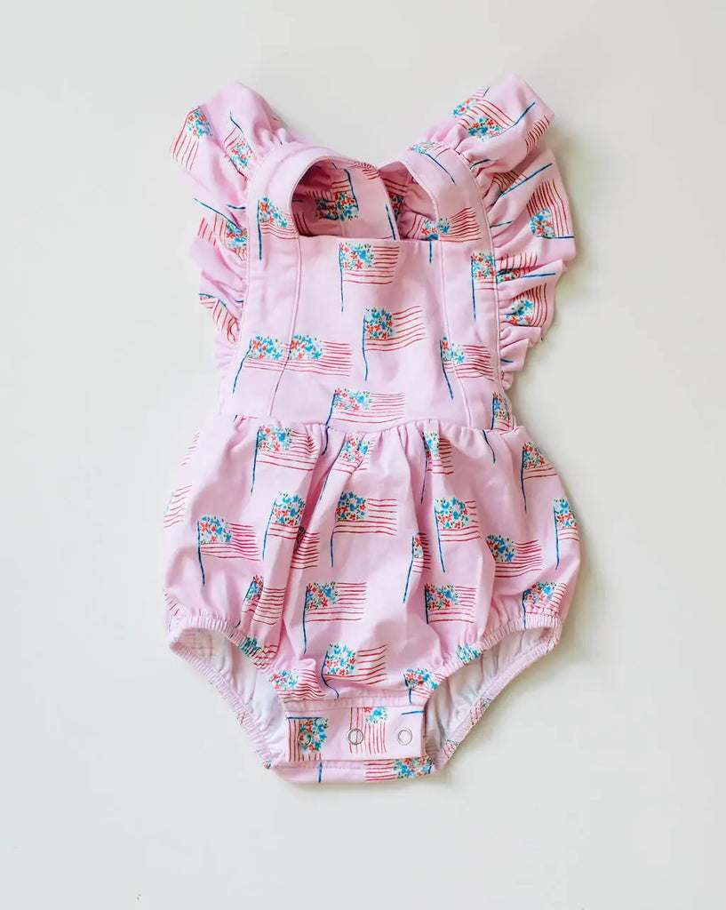 Featuring ruffled details along the shoulders and down the back, as well as adjustable straps for growing babes.