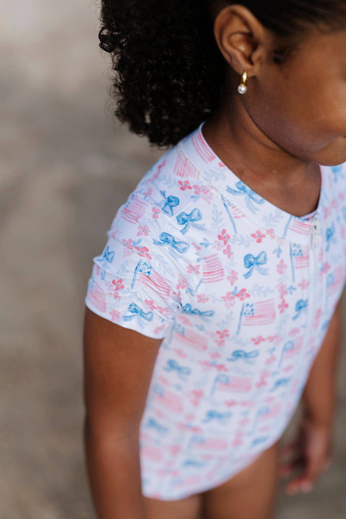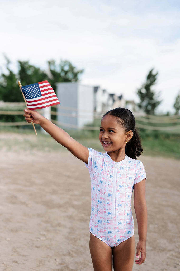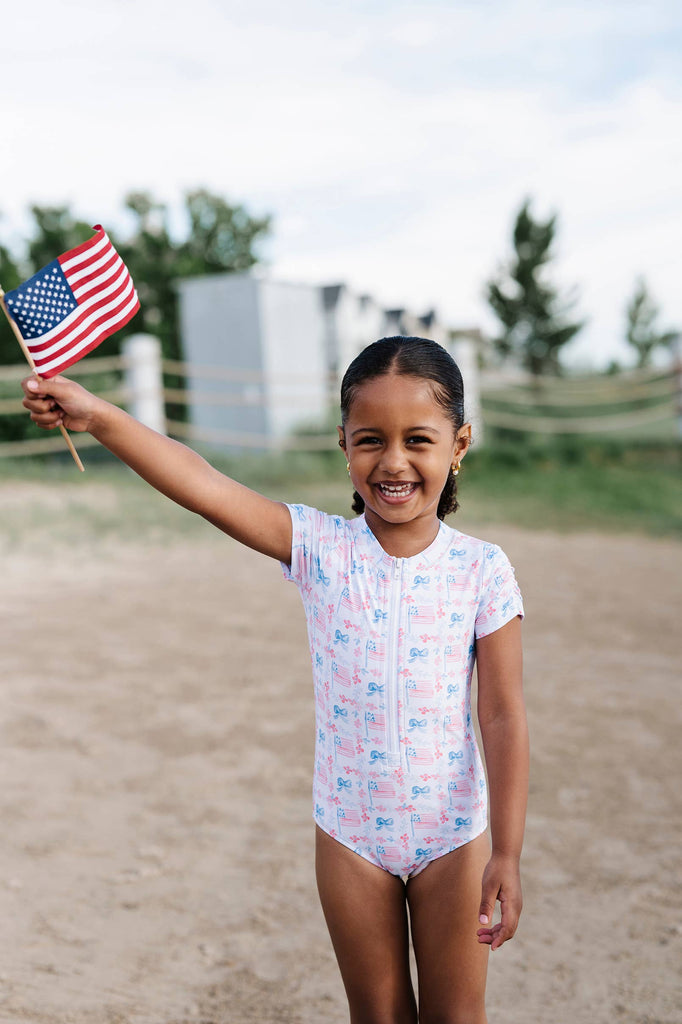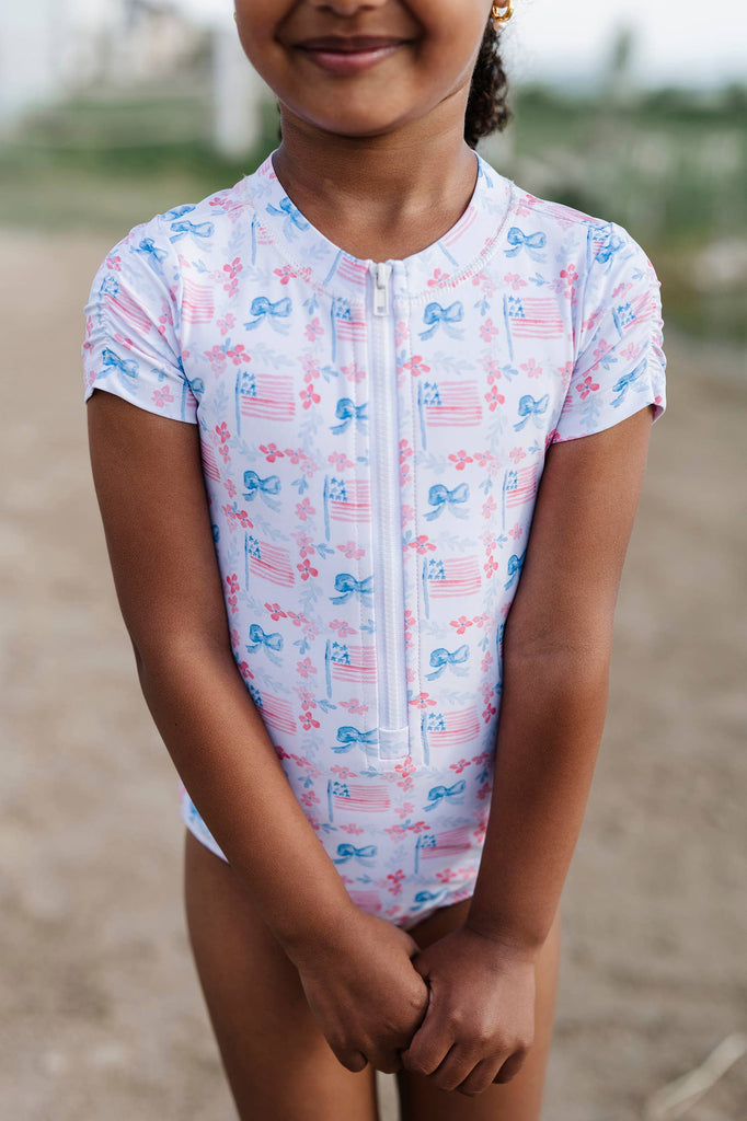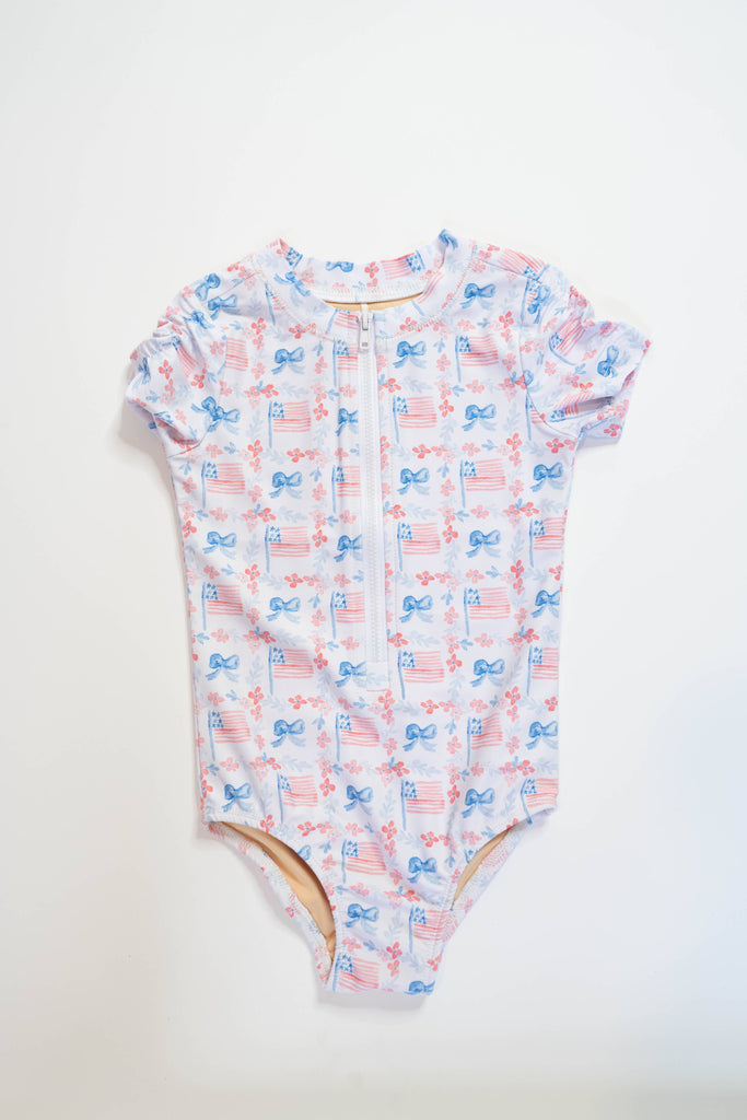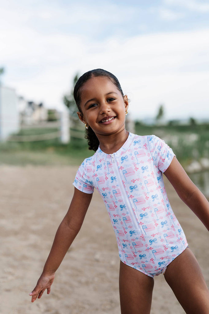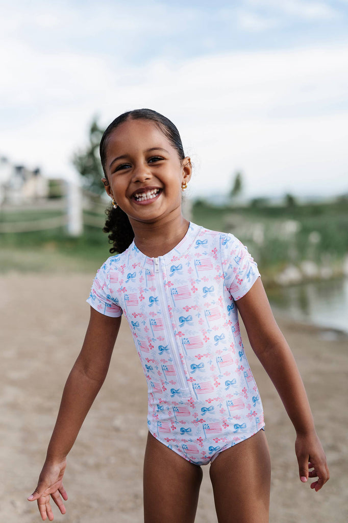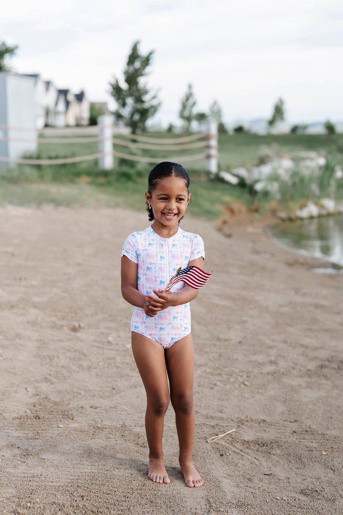 This short sleeve one piece swim suit with a front zip and fold over top zip protector features a UPF 50 protected fabric with beige lining in a fun summer print!