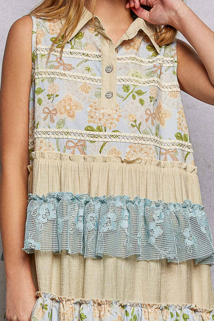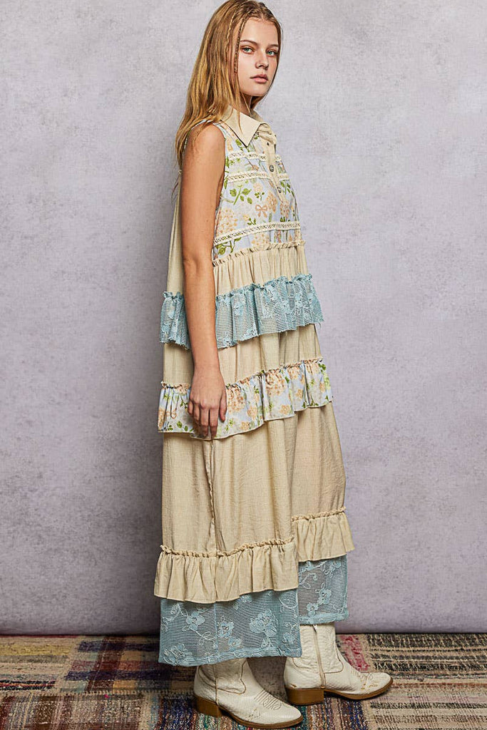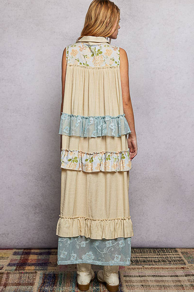 Designed in classic shirt neck sleeveless relaxed fit maxi dress in rayon with crochet & floral pattern contrast, lace trim and ruffles.