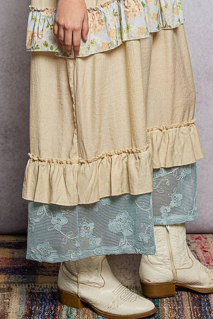 Shirt Neck Crochet Floral Lace Ruffle Rayon Maxi Dress
