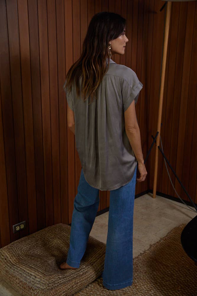 Woven Satin Collar Neck Short Cuff Sleeve Button Down Top