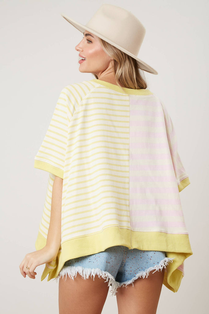 Mixed Stripe Oversized Sweatshirt - Short sleeves - Mixed stripe blocks - Asymmetric high-low cut - Round neck - Oversized 100% Cotton