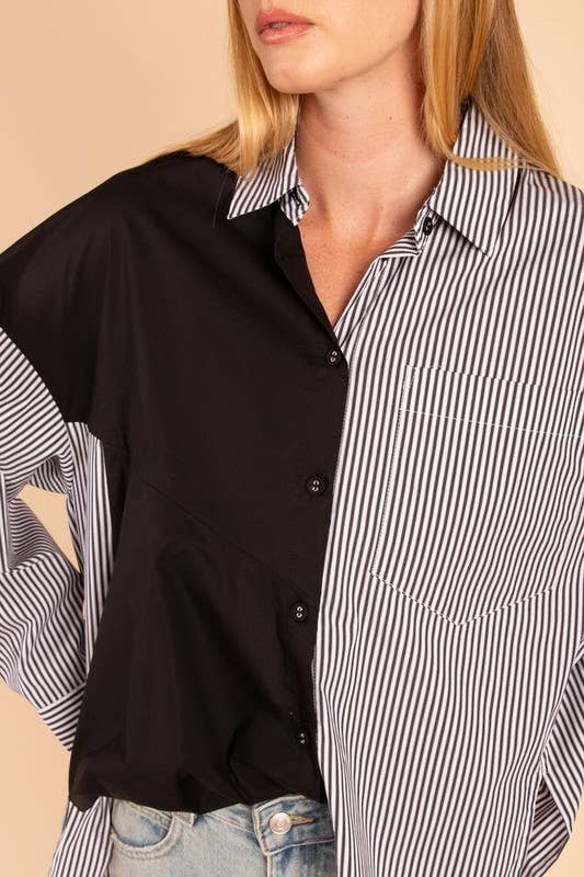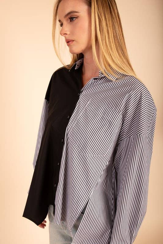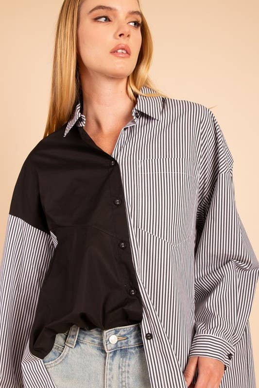Make a bold statement with the Asymmetrical Monochrome Button-Up Shirt, featuring a unique split design with solid black and black-and-white stripes. This eye-catching shirt combines modern style with classic elements, offering a versatile piece that stands out in any wardrobe. Perfect for both casual and semi-formal occasions, this shirt adds a touch of avant-garde flair to your look.