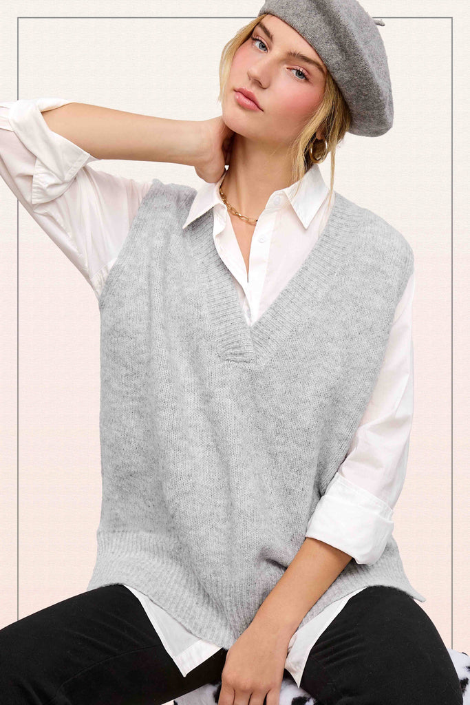 soft knit fabric, oversized, loose fit, layering piece, side slit, sweater vest, vest top, sleeveless, v neck, fall, sweater for women