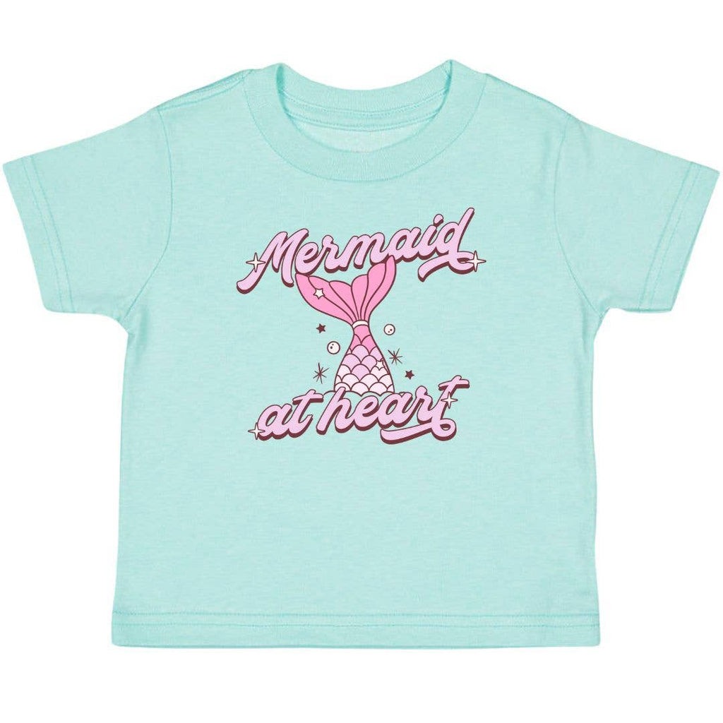 The Mermaid At Heart Short Sleeve T-Shirt is a fun and festive t-shirt for any mermaid celebration or everyday wear! Features: * Shirt Color: Aqua * Graphic Color: Pink, Lavender, White * Material: 100% Cotton * Features: Tagless inside neck label for an itch-free wear * Fit: Toddler Unisex; True to Size * Care: Machine washable, tumble dry low, wash with like colors Each t-shirt is hand pressed with love using baby and child safe inks.