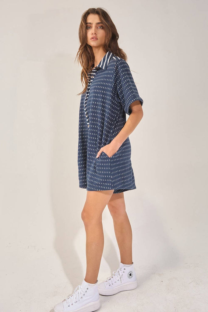 Dash Dot Print Fabric Collared Neck Romper: Dark navy