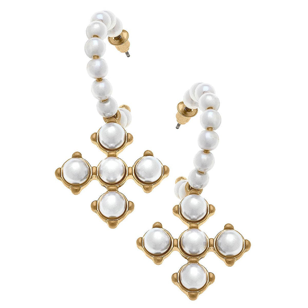 Sarah Pearl Cross Beaded Drop Hoop Earrings in Ivory